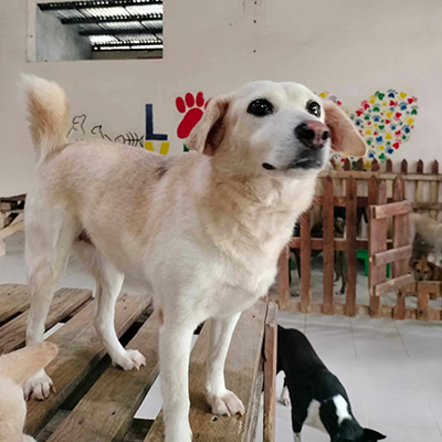 Gender: Female Age: Adult Color: Off-White Description: Small dog; Undergoing Chemo treatment and will need surgery for dislocated right leg Location: Bulacan Shelter